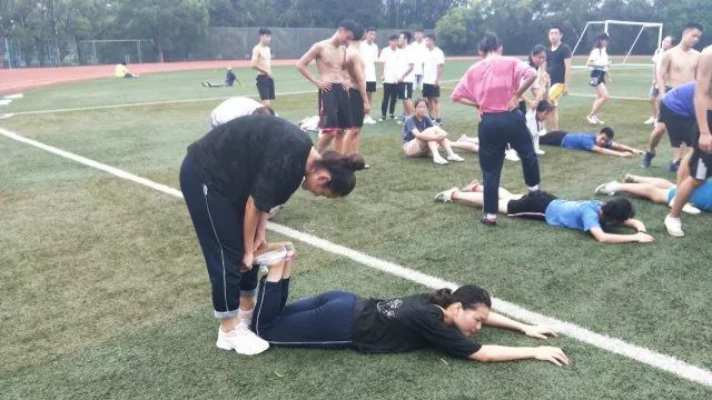 在给各位同学测试之前,为避免大家受伤,宋老师耐心仔细地带着他们做着准备动作,强调将身体热开后运动。