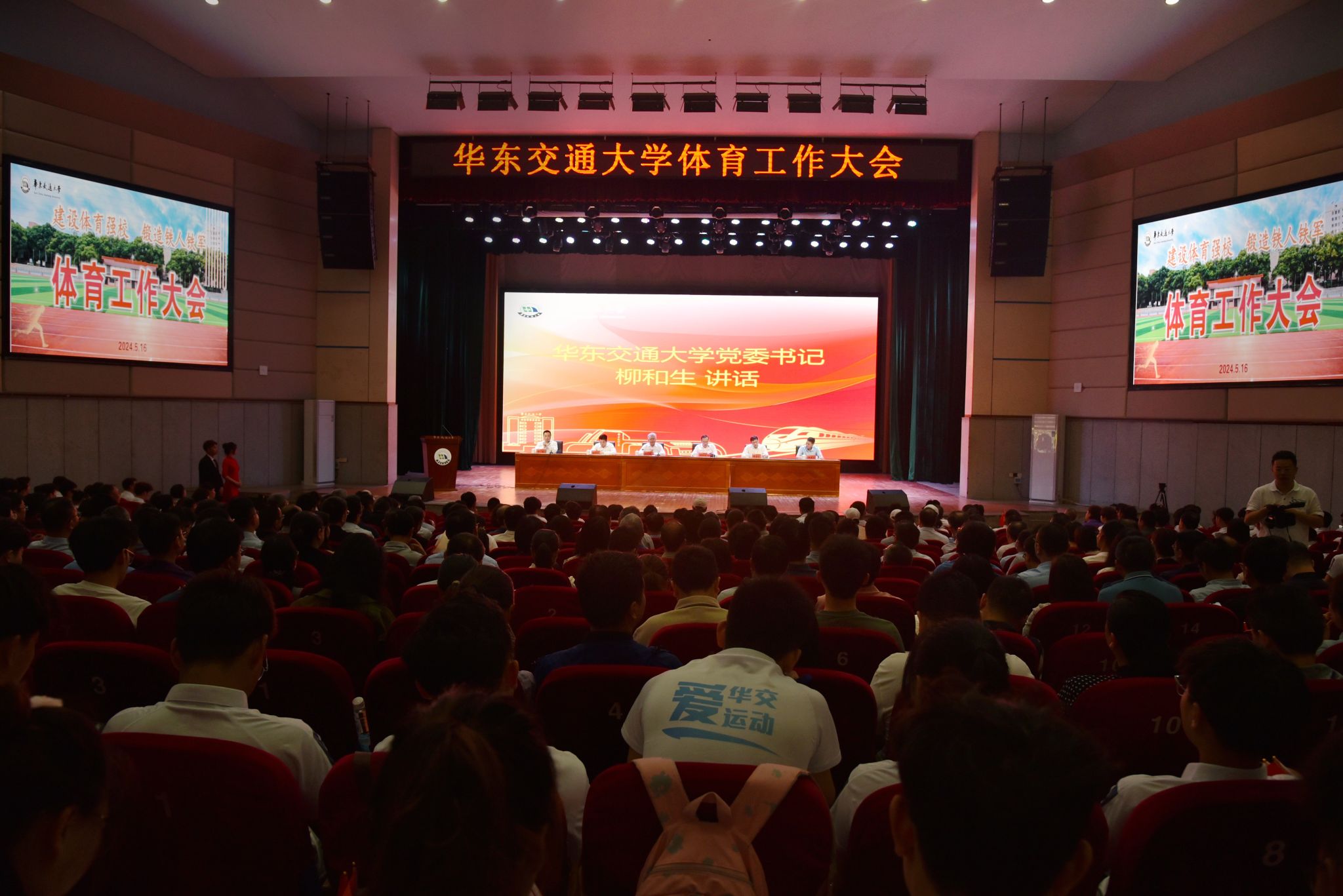 柳和生以“建设体育强校 锻造铁人铁军”为题作主旨讲话。他指出,首次召开全校性的体育工作大会,就是要回头看前情何如,抬头望如何前行,不断开创学校体育事业高质量发展新局面。回头看,佳作频频出——交大体育已然交出了“大好作品”。体育教育有声有色、竞技体育出新出彩、群众体育如火如荼。抬头望,繁花朵朵开——交大体育依然要浇开“大美花朵”。要刷新体育佳绩,发展体育强校,群众体育更广泛,竞技体育更有范,公共体育再发力,专业体育再发展。要创新体育“加”法,发挥体育强效,体育为教育加油,体育是教育的“加油站”;体质为素质加料,体质是素质的“加料包”;体能为才能加力,体能是才能的“加力杆”。要锻炼铁筋铁骨铁体质,要镕造铁心铁血铁意志。